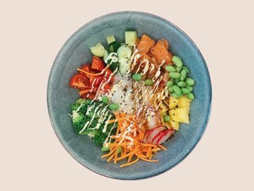 Salat med ris, edamame bønner, mango, broccoli, gulerødder, cherry tomat, sesamfrø, teriyaki & mayo sauce... Vælg i mellem: Laks/ Kylling/ Rejer/ Tofu. .