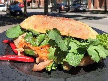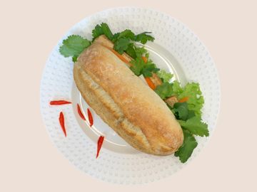 Vietnamese sandwich with pickled carrots and radishes, lettuce, cucumber and herbs. With chicken, bbq pork or beef.