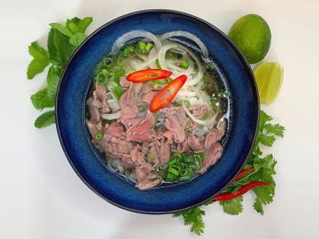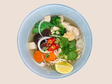 Vietnamesisk PHỞ (nuddelsuppe med Oksekød eller Kylling eller Tofu) med risnudler, forårsløg, citron og krydderurter.