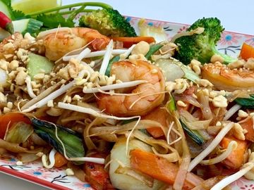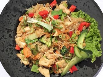 Fried PHO rice noodles with vegetables and tofu, spring onions, peanuts.