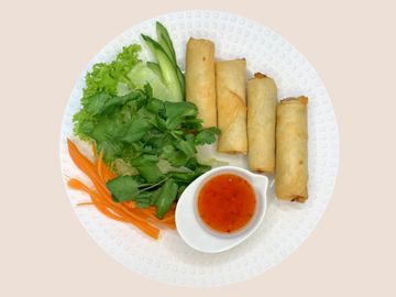 Vi Việt forårsruller med svinekød og grønt, hermed sød chilisauce (3 stk).