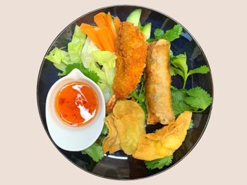 02 Wontons, 01 Spring rolls, 01 Deep fried prawns and sweet chili sauce.