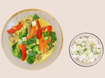 91: Vegan - Cà ri vàng / Gul karry (ikke spicy) med grønt og tofu / Yellow curry (not spicy) and vegetables with tofu.