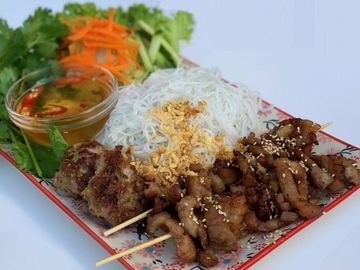 Grillet svinekød og Vietnamesiske frikadeller. Severes med risnudler, salat, agurk, krydderurter, citrongræs, sesam, jordnødder, risteløg, Nước mắm (klar fiskesauce).