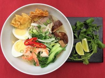 Wonton egg noodles soup with BBQ pork, boiled egg, tiger prawns, cabbage, deep fried chicken wontons and herbs.