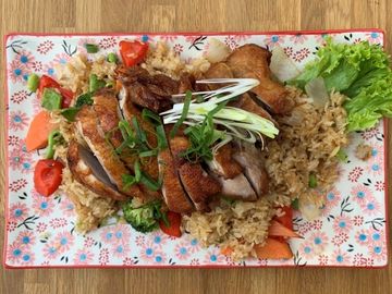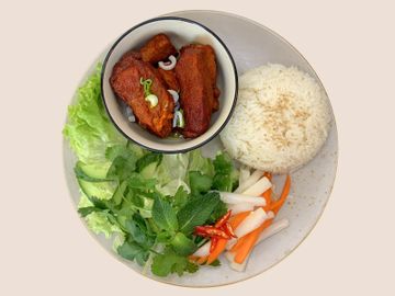 Traditional caramel pork, served with rice, salad, pickled carrots-radishes .