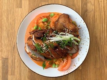 Steamed bun with pickled carrots, cucumber, herbs, sesam, chili with BBQ pork/ chicken or beef.