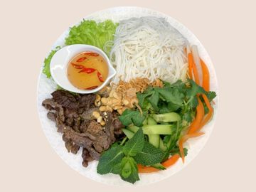 Vi Việt BUN rice noodles with beef, and lettuce, carrots. Served with Nước mắm(Vietnamese fish sauce), roasted peanuts, fried onions and herbs .