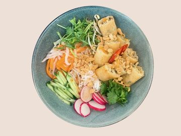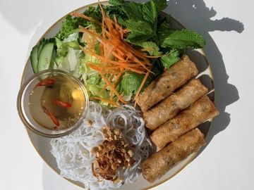 Vietnamese vegan - spring rolls with BÚN rice noodles, lettuce, and herbs. Served with soya sauce, sweet chili sauce and roasted peanuts, fried onions .
