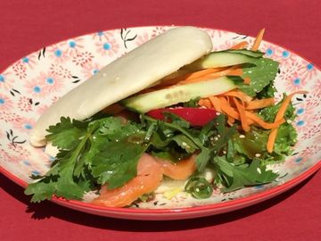 Vegetarian steamed bun with pickled carrots, cucumber, herbs, sesam, chili with Tofu (vegan) or Egg.