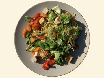 Stegte æggenudler med grønt og tofu, forårsløg.