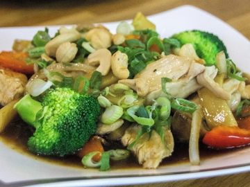 Østerssauce med grøntsager og kylling, cashewnødder // Oyster sauce with vegetables, chicken, and cashew nuts.