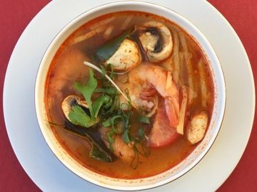 Spicy tom yam suppe med kylling eller tigerrejer.